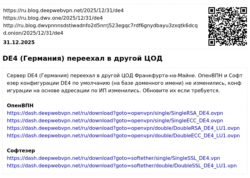 Сервер DE4 (Германия) переехал в другой ЦОД Франкфурта-на-Майне. ОпенВПН и Софтезер конфигурации DE4 по умолчанию (на базе доменного имени) не изменились, конфигурации на основе адресации по ИП изменились. Обновите их если требуется.