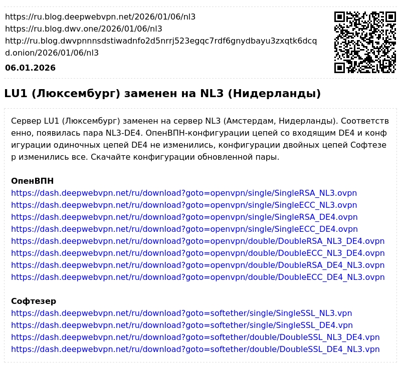 Сервер LU1 (Люксембург) заменен на сервер NL3 (Амстердам, Нидерланды). Соответственно, появилась пара NL3-DE4. ОпенВПН-конфигурации цепей со входящим DE4 и конфигурации одиночных цепей DE4 не изменились, конфигурации двойных цепей Софтезер изменились все. Скачайте конфигурации обновленной пары.