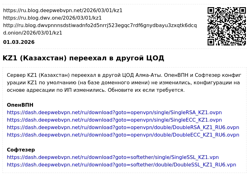 Сервер KZ1 (Казахстан) переехал в другой ЦОД Алма-Аты. ОпенВПН и Софтезер конфигурации KZ1 по умолчанию (на базе доменного имени) не изменились, конфигурации на основе адресации по ИП изменились. Обновите их если требуется.