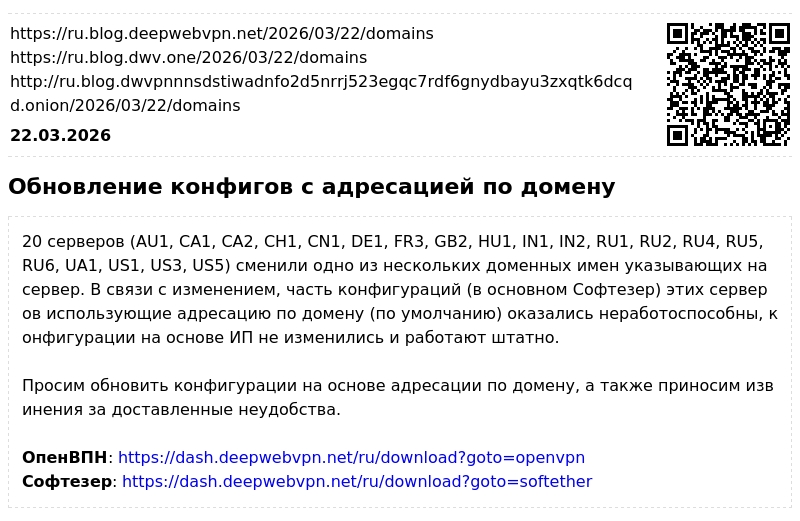 Серверы CA1 (Торонто, Канада), DE2 (Франкфурт-на-Майне, Германия), IN1 (Мумбай, Индия), KR1 (Сеул, Юж. Корея) и RS1 (Белград, Сербия) переехали в другие ЦОДы. ОпенВПН и Софтезер конфигурации CA1, DE2, IN1, KR1 и RS1 по умолчанию (на базе доменного имени) не изменились, конфигурации на основе адресации по ИП изменились. Обновите их если требуется.